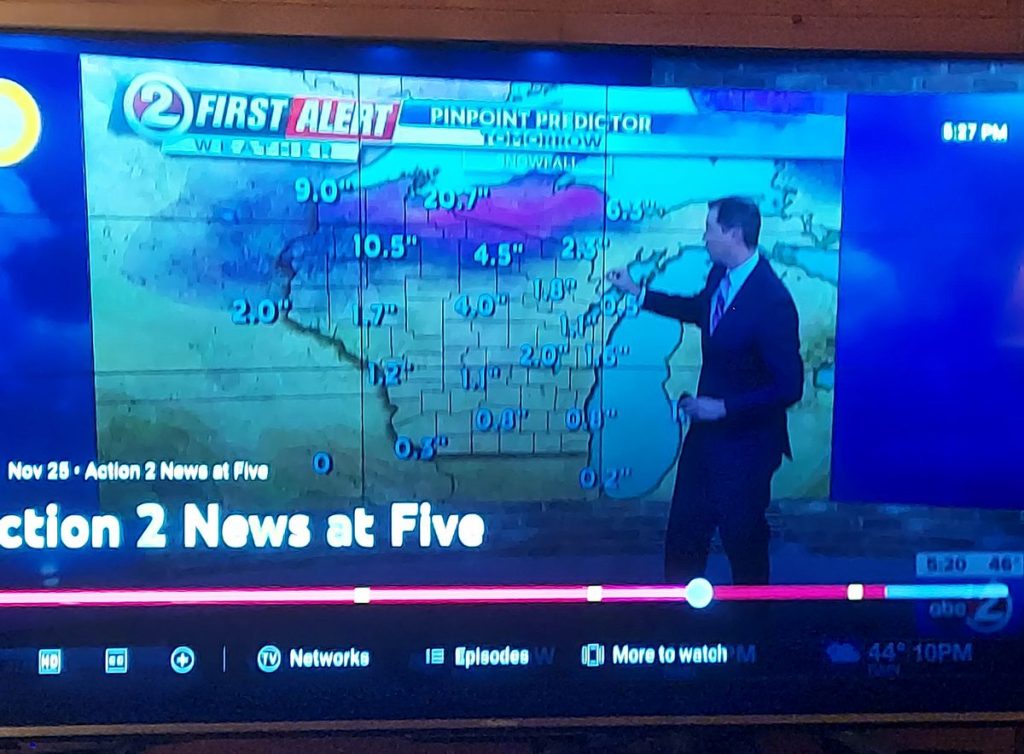 This storm is the entrance to winter. I’m picturing Jack Nicolson in The Shining, “Here’s Johnny!”. Our average high temperature is in the upper 30s. We will not see 32 after tomorrow morning for at least a week. There is a storm possible for the weekend that has potential, followed by a high temperature of 19 or 20 Monday and Tuesday.