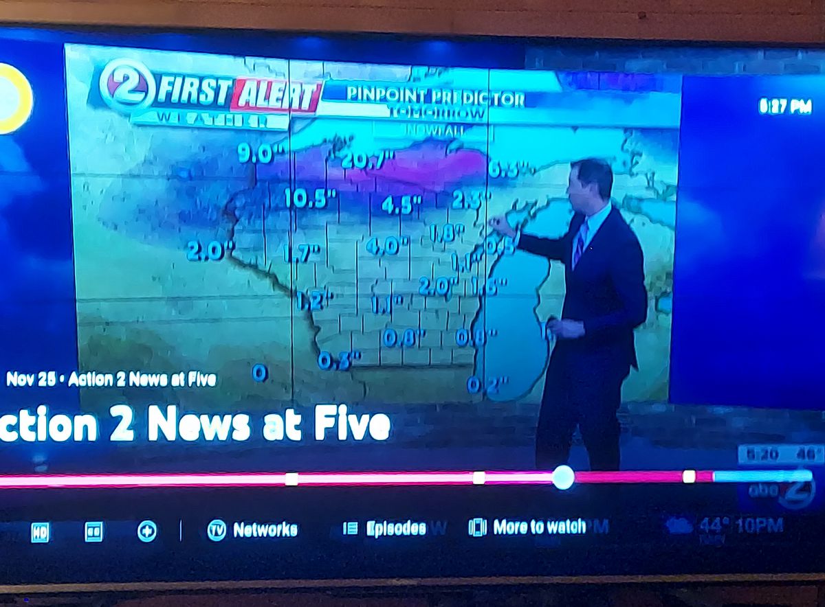 Here is a screen cap from the Green Bay TV 2. Most models and forecasts that I have seen are in pretty good agreement.